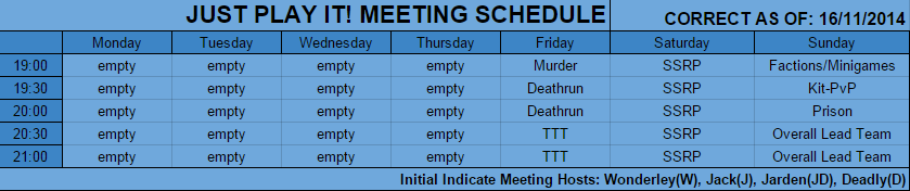 This thread contains all JustPlayIt server meeting times, please note that the schedule is subject to change and all times are in GMT (London).